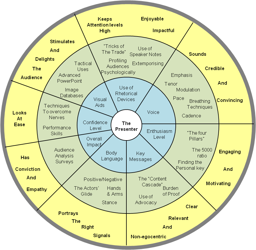 The outermost ring (in yellow) shows the benefits gained by the delegates when the specific coaching topics are implemented. This is our "end game" - to help the people we train become totally "Rounded Presenters", where all of the listed benefits are enjoyed.